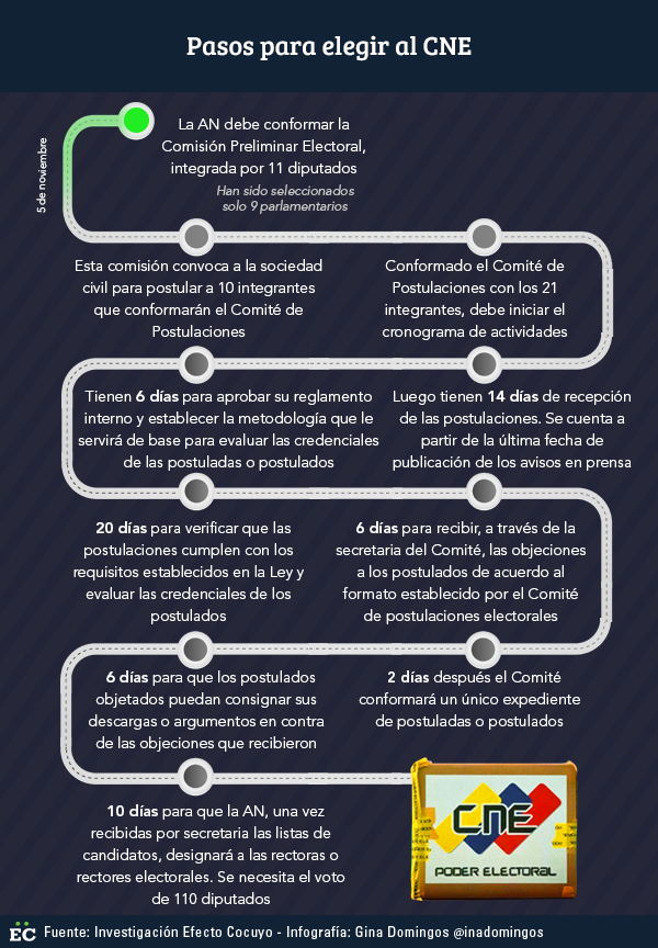 Primer paso para nombrar al CNE. La Asamblea Nacional (AN) inició el proceso para la designación de nuevas autoridades del Poder Electoral, con el nombramiento de la Comisión Preliminar Electoral. Sin embargo, esta primera instancia, está incompleta, con 9 de los 11 parlamentarios correspondientes.
