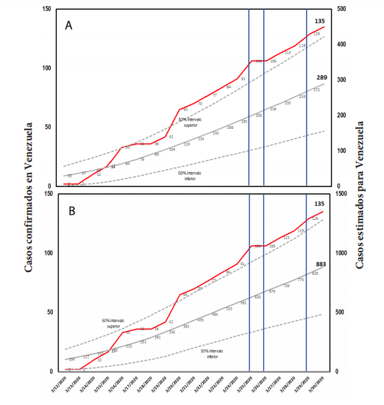 Los resultados de ambas simulaciones están por encima de los casos oficialmente reportados. El primero, el más conservador, estima 289 casos para el 30 de marzo. Para esa fecha se habían reportado 135 casos oficiales. Además, usando esa metodología, el inicio de la epidemia en el país puede trazarse a los primeros días de marzo, dos semanas antes del anuncio del primer caso.