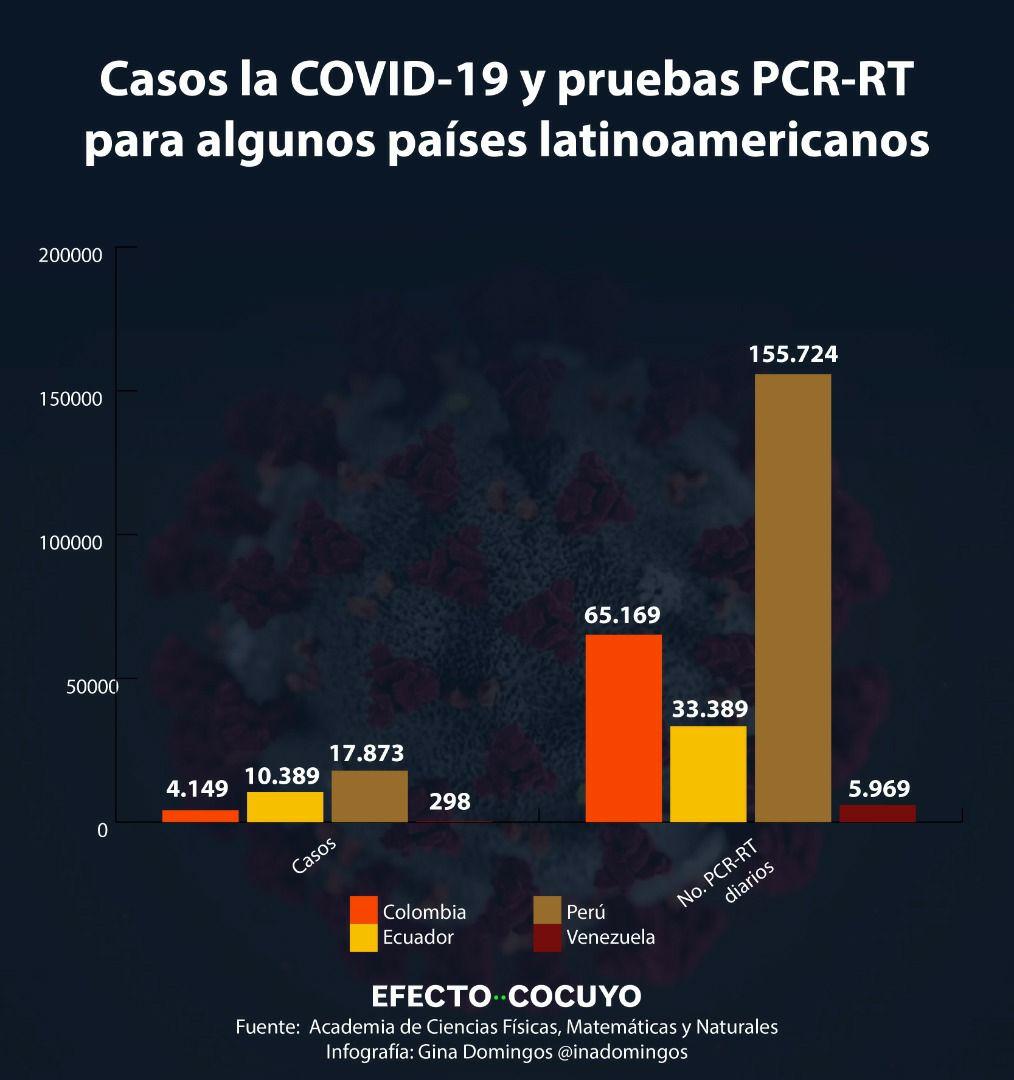 Sobre la primera, les preocupa las cifras de las pruebas realizadas. La única prueba aceptadas y validadas por la Organización Mundial de la Salud para determinar si una persona está infectada o no con el virus es la prueba de la reacción en cadena de la polimerasa con transcriptasa inversa (PCR-RT, por sus siglas en inglés), y de esas Venezuela solo ha hecho 5.969, cinco veces menos que Ecuador, Colombia o Perú. Por ejemplo, Colombia hace, en promedio, 4.000 pruebas diarias. El país tiene capacidad para hacer cerca de 12.000 pruebas diarias y poco a poco se van habilitando más laboratorios para alcanzar esa cifra.