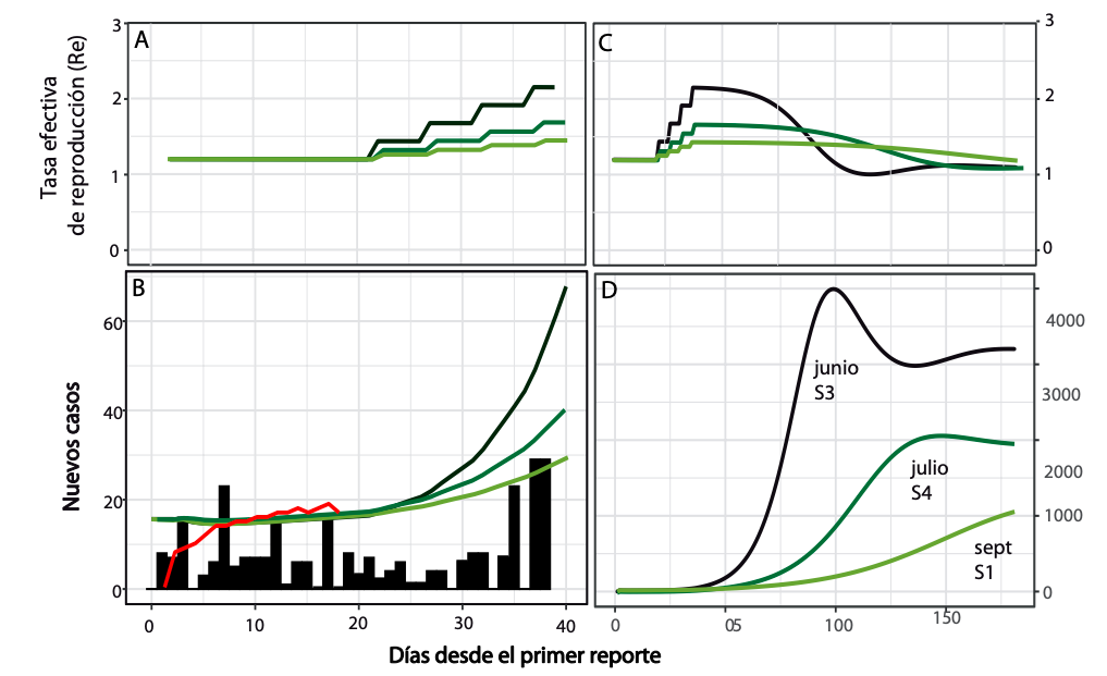 Con eso se desarrollaron tres escenarios con diferentes velocidades de contagio pero con un mismo resultado: más de mil casos por día para el pico de la epidemia. En el escenario trabajado con una tasa de contagio más leve, el modelo predice un pico de un poco más de 1.000 casos nuevos cada día después de la primera semana de septiembre. En el de un aumento sustancial en la tasa de contagio se esperan más de 4.000 nuevos casos por día durante la primera semana de junio.