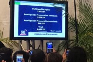 Con un 87,44% de las actas de totalización de la participación digital y la presencial este sábado, 12 de diciembre, anunciaron que hubo 6.466.791 votos: 3.209.714 presenciales en Venezuela, 844.723 presenciales en el exterior y 2.412.354 por las plataformas digitales.
