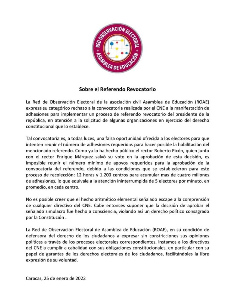 La Red de Observación Electoral de la asociación civil Asamblea de Educación (ROAE), rechazó este martes la convocatoria del Consejo Nacional Electoral (CNE), para este miércoles 26 de enero, en torno a la activación del referéndum revocatorio contra Nicolás Maduro.