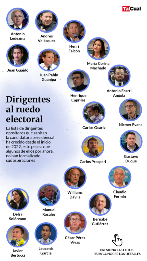 Para efectos de este trabajo, se contabilizaron, al menos, 20 precandidatos opositores para convertirse en el abanderado unitario en las elecciones presidenciales que, según la Constitución, toca hacer en 2024.
