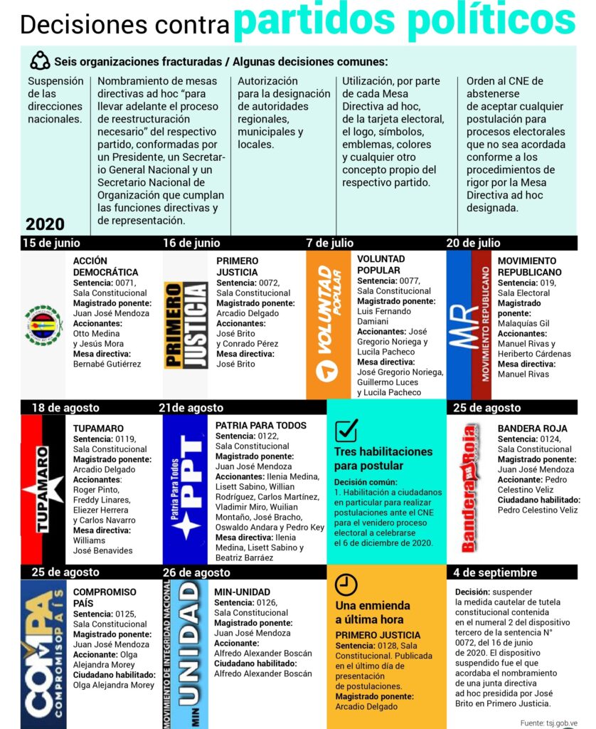 No es la primera vez que el TSJ es utilizado como brazo ejecutor de la intervención de partidos políticos. El antecedente más claro ocurrió a mediados de 2020, cuando partidos de la oposición mayoritaria, e incluso oficialistas disidentes, fueron tomados con sentencias similares.
