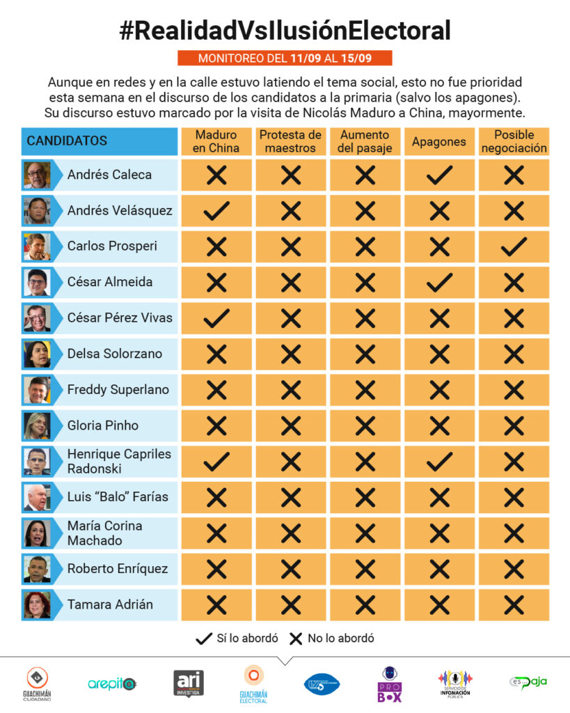 En un monitoreo que hizo el Guachimán Electoral del 11 de septiembre al 15 de septiembre, tan solo 3 de 13 candidatos comentaron sobre la visita del mandatario Nicolás Maduro en China. Durante su estadía, firmó con el presidente de China, Xi Jinping, varios acuerdos de cooperación bilateral centrados en áreas como la economía, el comercio y el turismo. Incluso hubo promesas de llevar al primer venezolano a la Luna.