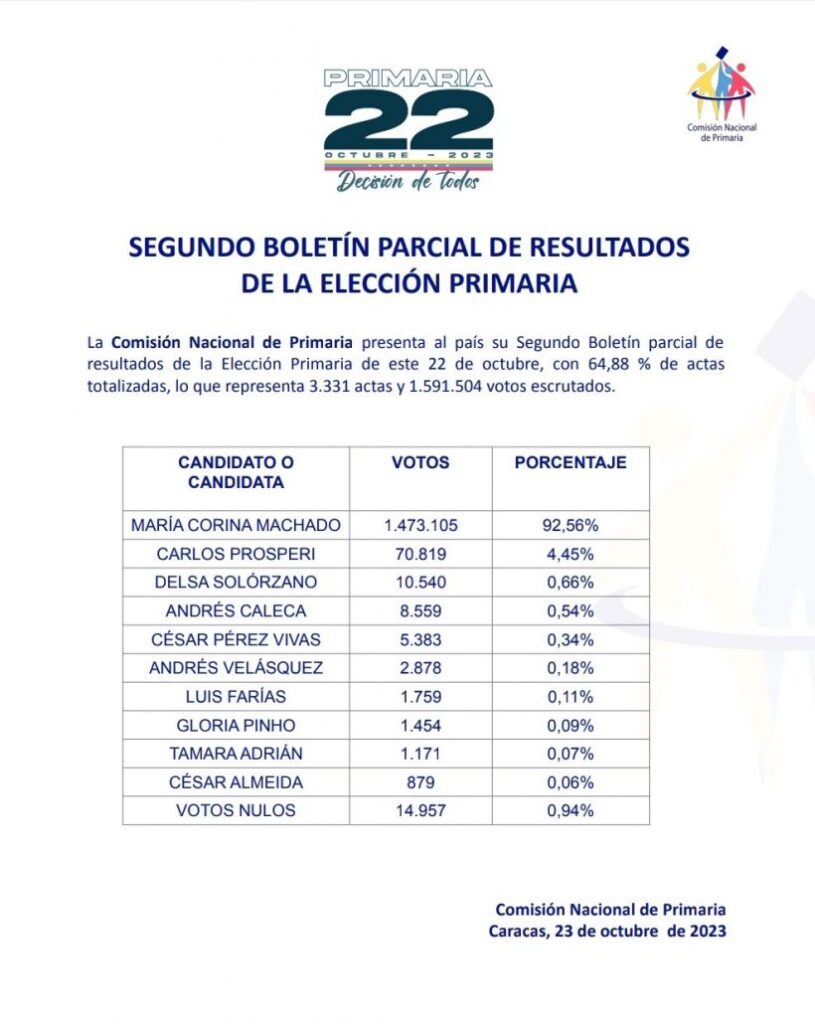 La Comisión Nacional de Primaria (CNdP) emitió un segundo boletín parcial de los resultados a 27 horas de haber finalizado la elección. Con 64,88% de las actas totalizadas que representan 1.591.504 boletas escrutadas, la tendencia del primer reporte se mantiene: María Corina Machado obtuvo 1.473.105 votos, es decir, 92,76% de la preferencia del electorado.