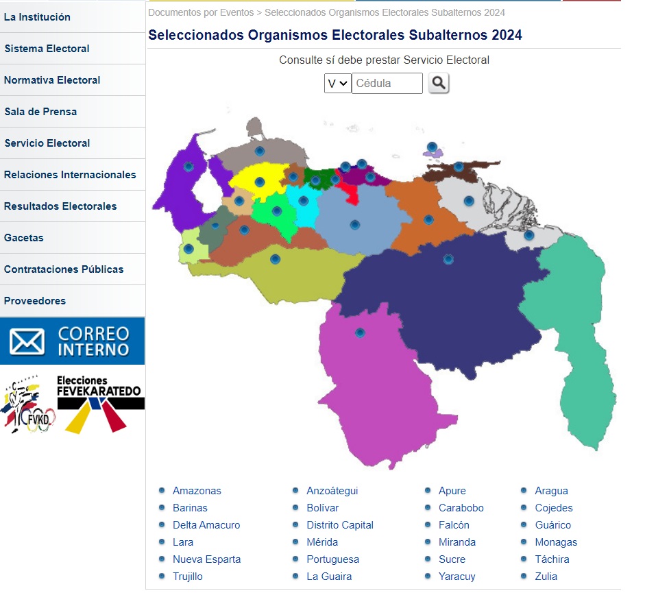 Los ciudadanos también pueden hacer clic en cada uno de los estados que aparecen en el mapa para consultar la lista completa de los miembros de mesa seleccionados en cada centro electoral, así como también a quienes conforman la Junta Regional, Junta Municipal y Junta Parroquial.