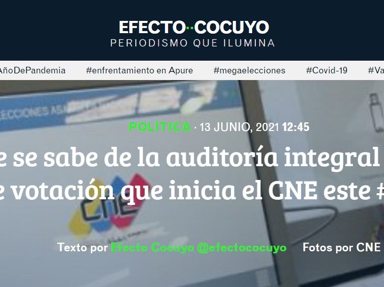 Efecto Cocuyo Este lunes 14 de junio inicia la auditoría integral del sistema automatizado de votación, anunciada por el Consejo Nacional Electoral (CNE). La verificación se suma a las 16 auditorías aprobadas por el ente comicial para las megaelecciones regionales del 21 de noviembre. De acuerdo con la presidenta de la Junta Nacional Electoral (JNE), […]