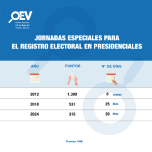 Observatorio Electoral Venezolano El CNE activa 315 puntos que son insuficientes para inscribir y actualizar los datos de millones de venezolanas y venezolanos que actualmente se encuentran rezagados, sin lo cual no podrán votar Mientras que en las presidenciales de 2018 —una elección que no fue competitiva— el Poder Electoral instaló 531 puntos para la actualización del […]