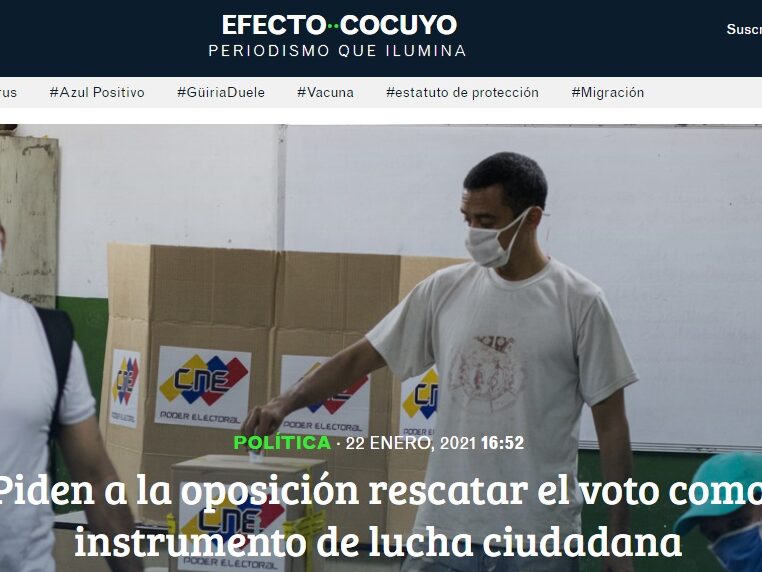Efecto Cocuyo Un grupo de periodistas, historiadores, políticos y empresarios propone a la oposición participar en las próximas elecciones “aún en las circunstancias más difíciles”. Eso sí, sin que la falsa promesa de un cambio inmediato se convierta en una “camisa de fuerza” que genere frustraciones. “El voto es el principal instrumento de lucha ciudadana […]
